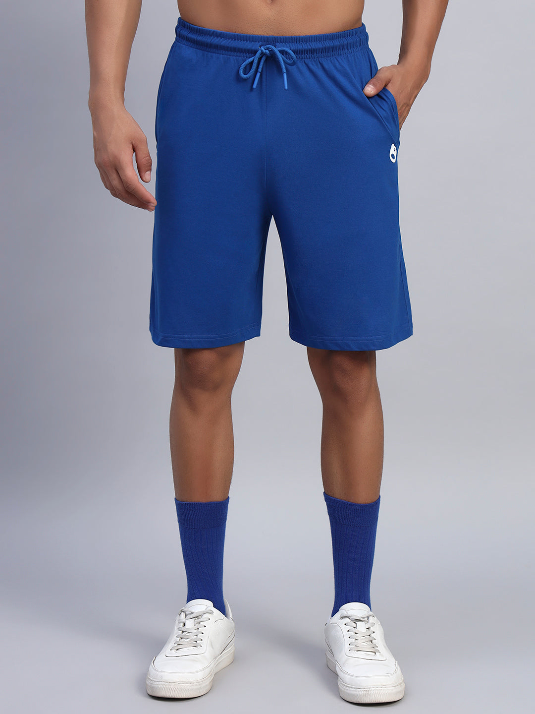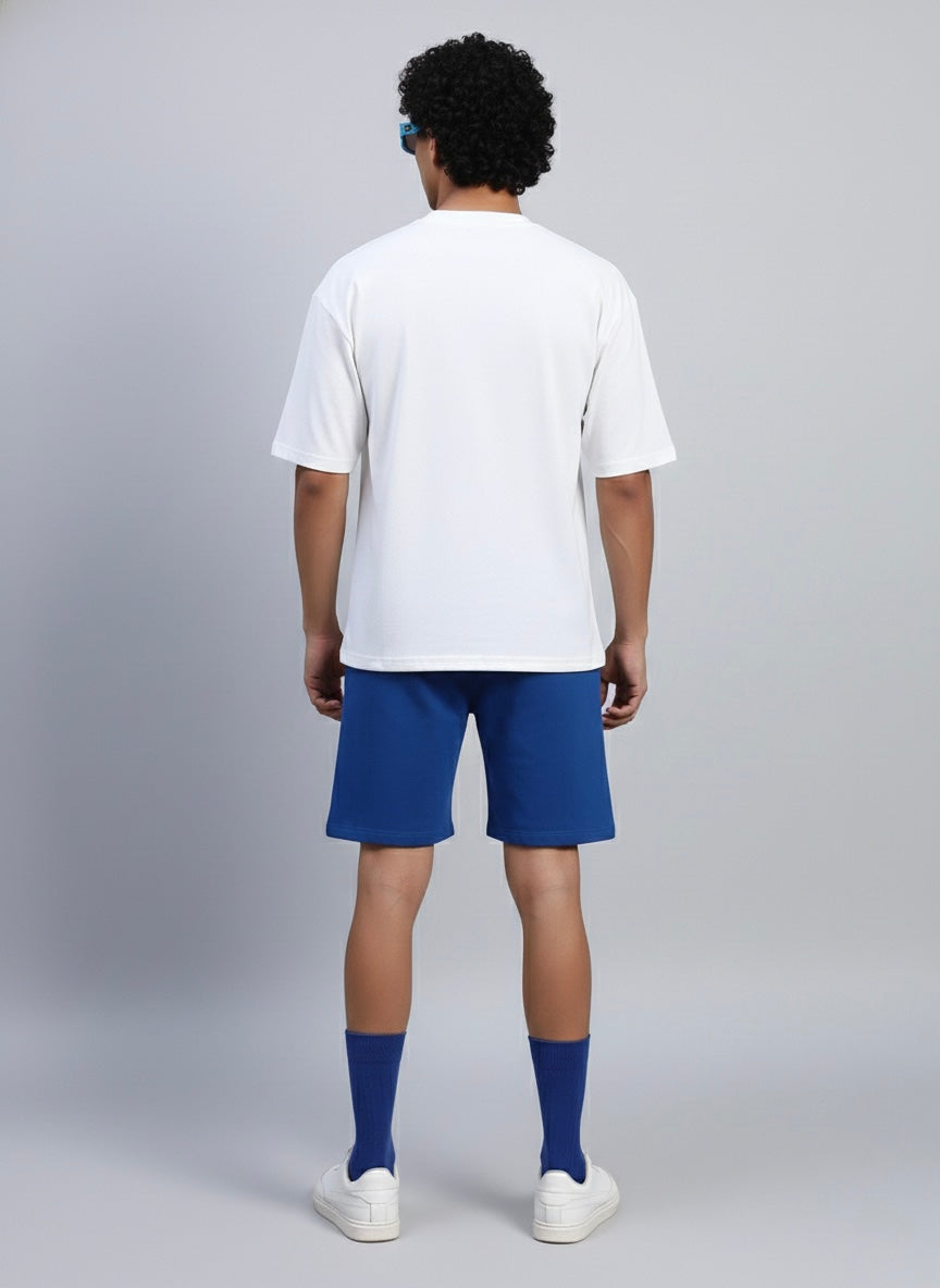 Pair it with matching royal blue shorts and white sneakers for a monochromatic street-ready look. Finish the outfit with futuristic shades and high-top socks to lean into the trend-setting Gen-Z vibe.
